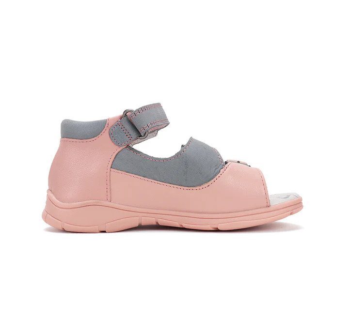 Pasztell rózsaszín és szürke színkombinációja letisztult, mégis kedves megjelenést ad a szandálnak.